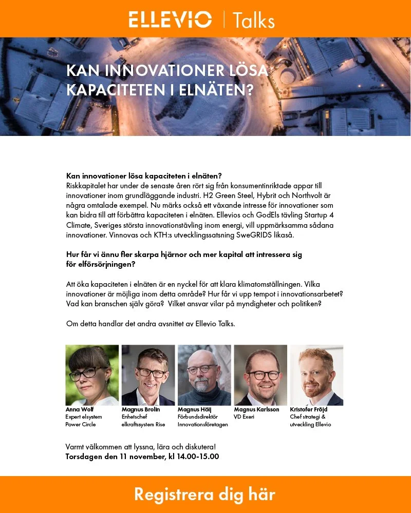 Kan innovationer lösa kapaciteten i elnäten? Torsdag den 11 november kl. 14.00 är det dags för Ellevio Talks, ett livesänt panelsamtal. Lyssna på bl.a Magnus Karlsson, VD på Exeri.